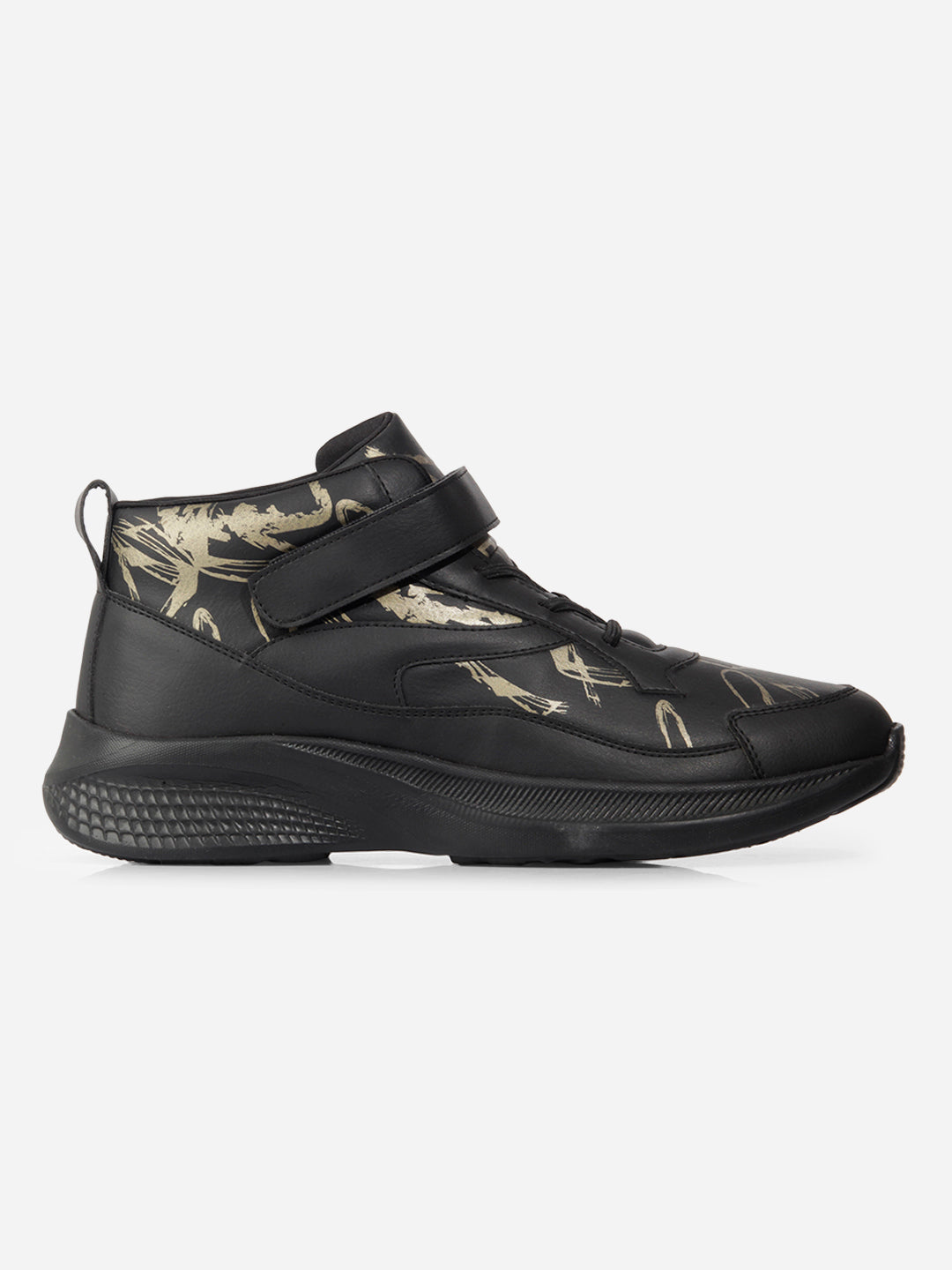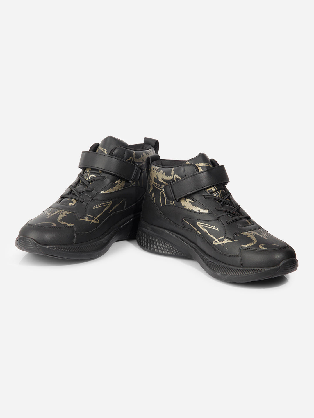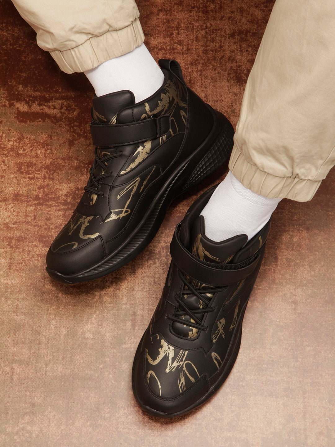 Introducing Our Stylish And Trendy Men's Lightweight Laceup Shoe, Featuring A Sleek Black Design With A Captivating Gold Print, Crafted With Utmost Precision, This Sneaker Combines Comfort And Fashion Effortlessly, Making It A Must-Have For Any Fashion-Forward Individual, The Lightweight Construction Ensures Ease Of Movement, While The Printed Detailing With Ankle Strap Adds A Touch Of Sophistication To Your Overall Look.
