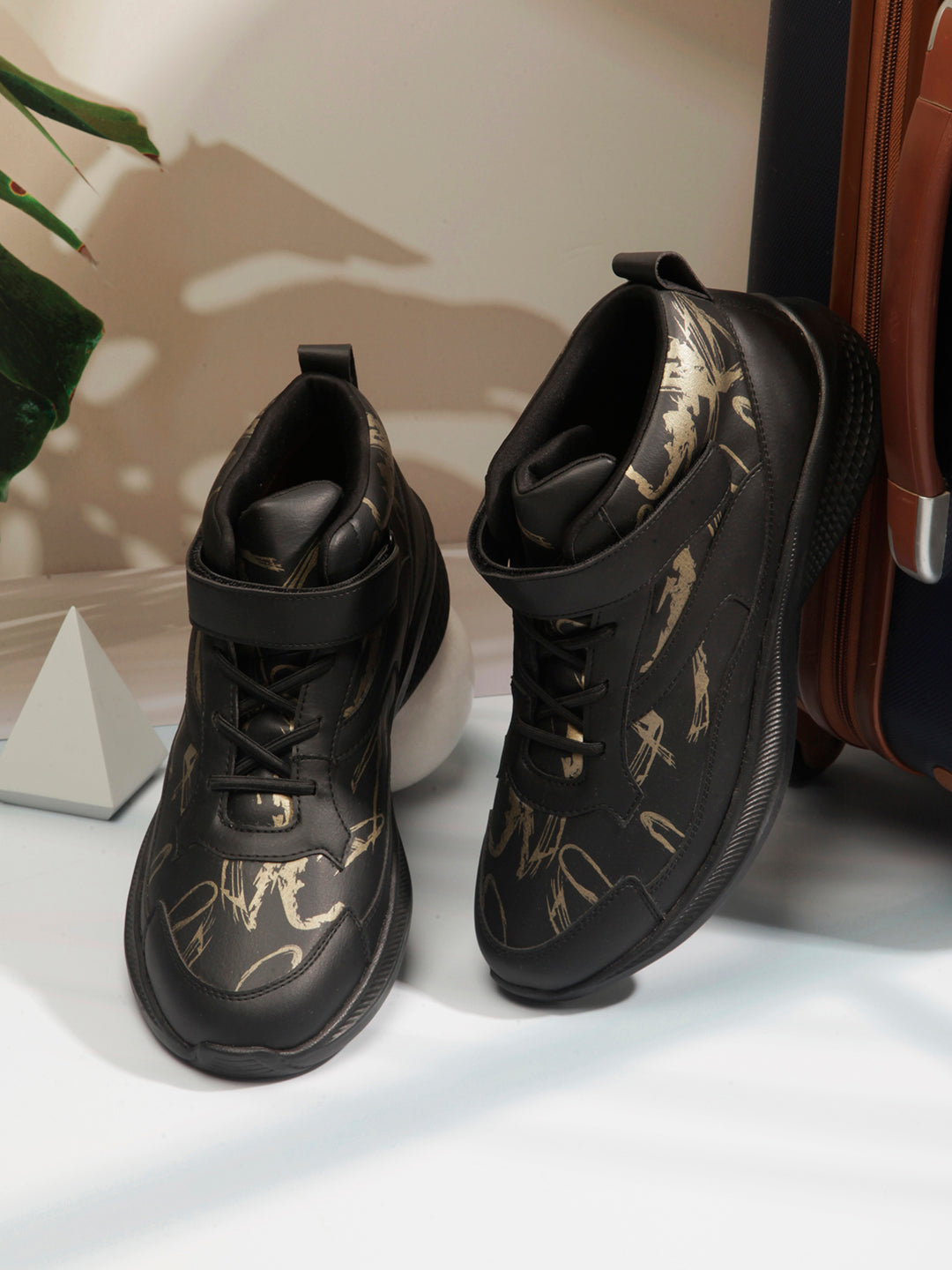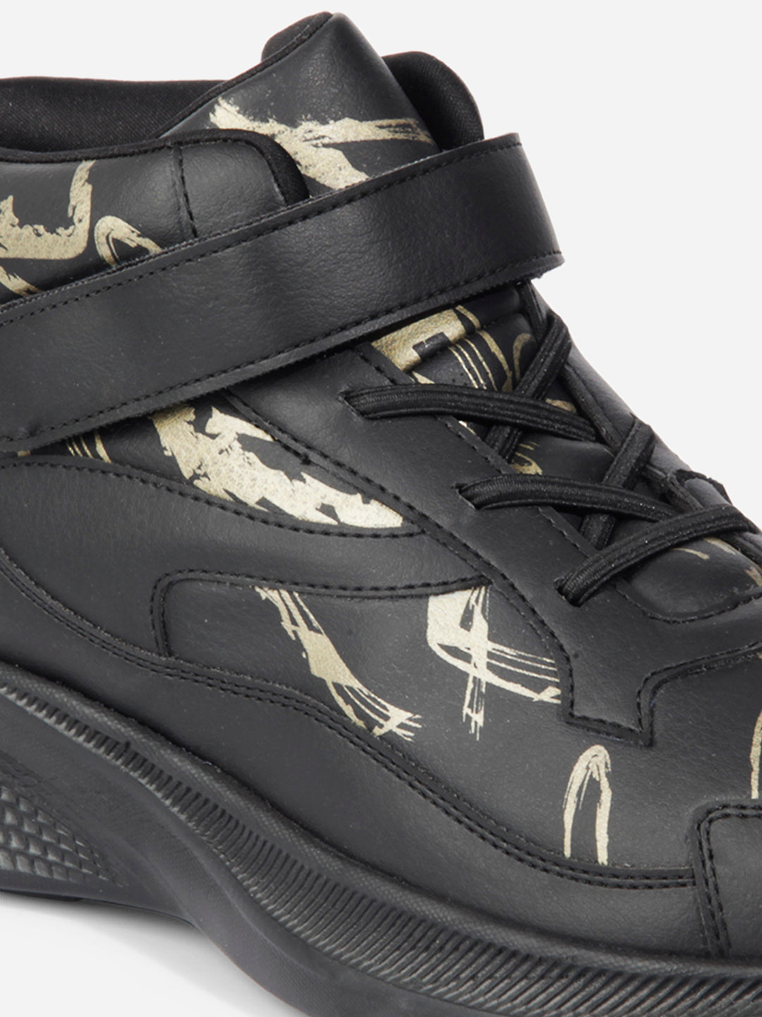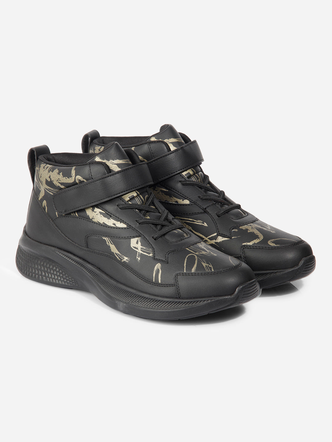 Introducing Our Stylish And Trendy Men's Lightweight Laceup Shoe, Featuring A Sleek Black Design With A Captivating Gold Print, Crafted With Utmost Precision, This Sneaker Combines Comfort And Fashion Effortlessly, Making It A Must-Have For Any Fashion-Forward Individual, The Lightweight Construction Ensures Ease Of Movement, While The Printed Detailing With Ankle Strap Adds A Touch Of Sophistication To Your Overall Look.
